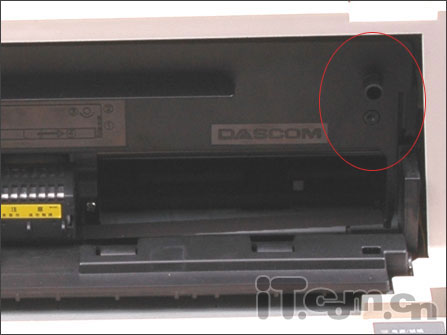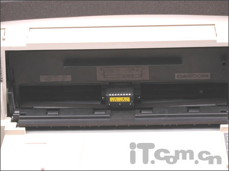 打开DS-1700机身前置的透明面板后,最为醒目的要数机器的最关键部件——打印头了。DS-1700的打印头采用目前市场上常见的0.2mm直径的24针设计,打印针寿命高达3亿次/针,而独到的打印针轮换和断针补偿功能的运用,则更进一步延长了打印头的使用寿命。另外,由于打印过程中打印针的机械摩擦运动会产生一定的热量,长期工作则会使打印针处于高热状态,很容易损坏或折断。为此,打印头通常都设有一个散热片装置。为了防止意外烫伤,DS-1700在其打印头上贴着一个非常醒目的黄色“注意”标签。