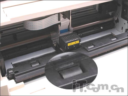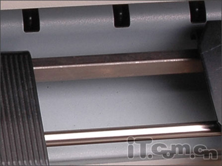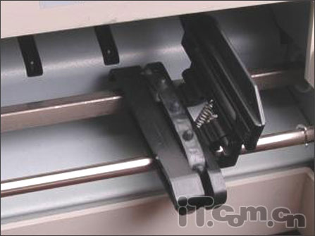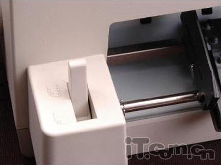 在打印头下前方,是一个摩擦进纸装置,用于单张纸的打印。而对纸张的大小和位置的固定,则根据透明盖板上的刻度和机身前面的固定装置实现。