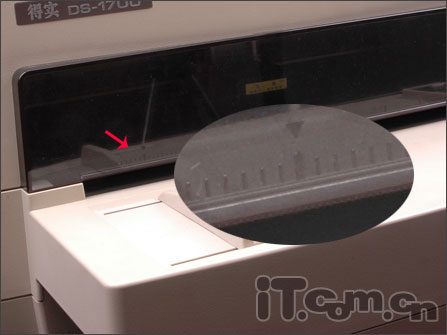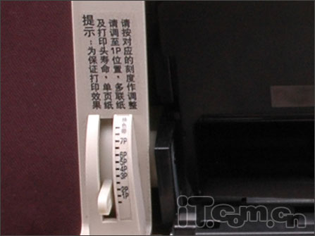 在打印头的左端机身上,是一个打印纸厚度的手动调节装置。把滑杆调到1P位置,通常是用来打印普通单页纸。如果要打印多联纸,则按相应的刻度作调整即可,如3联则把它调到3P。上面显示的最大刻度是7P,也说明了DS-1700具备了最多1+6张的普通多联纸拷贝能力。7P再往上拨,是一个换色带档位。同一段色带用久了,打印出的墨色就会变浅,这时,用户就可以使用它方便地自动更换新的色带段进行打印了。