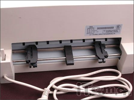 DS-1700的进纸系统除了前面的摩擦进纸装置以外,在机身后面还有一个齿轮送纸器,用于打印票据业务和流水作业。送纸架中间是一个小托盘,两边则是两个可以左右滑动或固定的链孔送纸夹,只要把小压板轻轻提起放入带边孔的链式纸,然后重新盖上,即可实现自动传送。在装纸过程中,注意要根据纸质的宽度,把两个送纸夹的锁定装置按下以固定位置,防止因不小心的滑动致使纸张皱摺。单页纸与链式纸间的工作模式转换,主要是通过机身后面的手动转换键实现的。